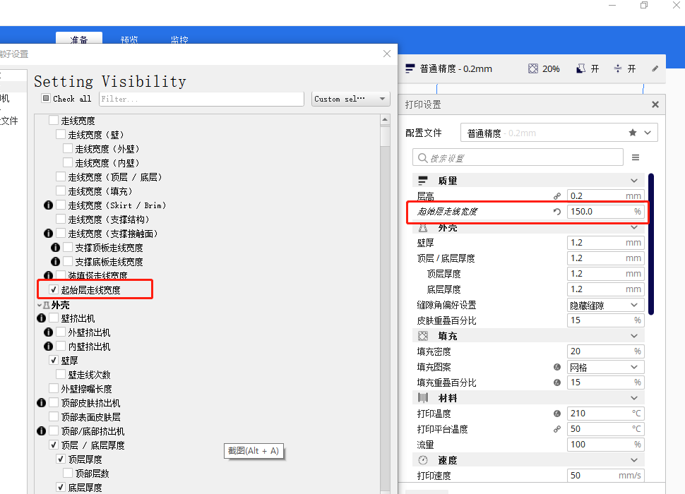 可對于起始層走線寬度進行修改,最高為150%比例,可提高起始層與熱床粘附的效果。